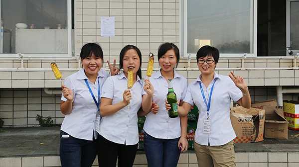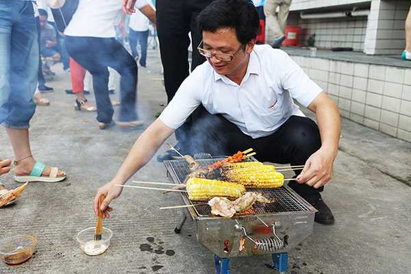 在光祥食堂外面,搭起了大屏,架起了40個燒烤爐,在燒烤爐的不遠處,是擺放食材的桌子,桌子上的食物已經堆成了小山,有燒烤用的雞腿、雞翅、面筋、豆腐塊、茄子、韭菜、辣椒、饅頭等等,也有喝的雪碧、可樂、啤酒,還有紅心柚、西瓜等水果。在管理中心全體同事的精心組織下,按照事先的人員安排,整個公司近500人全部分成40個小組,分布在40個燒烤爐上盡興燒烤,每一位同事都親自動手,盡力展現自己的廚藝。大家一個個挽著袖子,在爐子旁生火、調作料、烤肉,自成一路,各顯神通,每一個程序都有條不絮地進行著。一會兒功夫,一串串的“創意”就等著上火了,伴著“滋滋 的響聲,雞翅、雞腿、玉米、火腿、青椒、饅頭等食物的香味四散飄逸,整個現場人頭攢動,青煙裊裊,在大屏幕背景音樂的映襯下,熱鬧非凡。