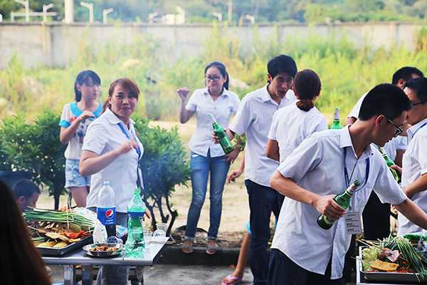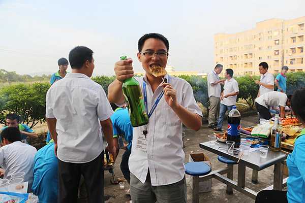 瞅,在整個燒烤活動中,還有一群人,他們手拿著啤酒瓶,在整個燒烤現場來回穿走,他們是在干嘛呢?“來,一起干” !循聲望去,嘿,看到了,原來他們是在給每桌的同事敬酒呢?