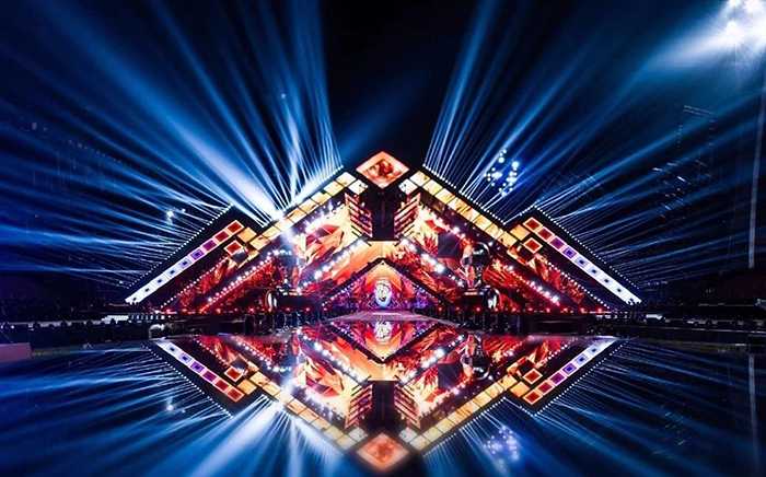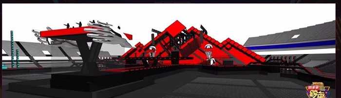 為了多維展現節目特效,舞臺正上空90°拼接透明屏與A字異形屏自然交融,遠觀呈V形勝利手勢,寓意勇者無往不勝。