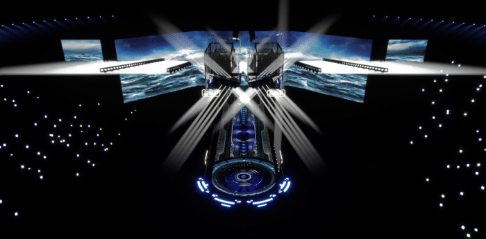 舞臺核心——兩大未來人類頭像均用LED顯示屏組成,從墨鏡到身體在黑夜里時隱時現,體現未來黑科技的神秘感。