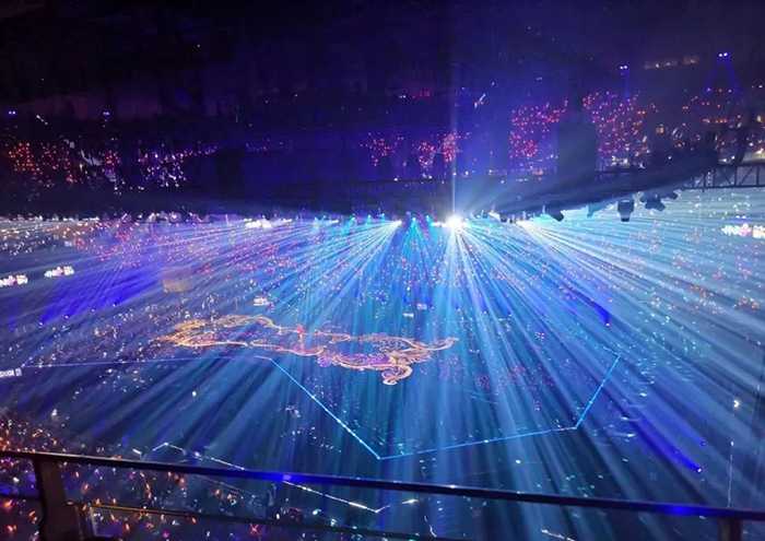 光祥600㎡LM地屏采取異形拼接方式,組成兩大不規則多邊舞臺,恰似彩蝶雙翼,欲蹁躚起舞。地面上每一幀動感高清影像追隨著舞臺參演嘉賓的節奏,似乎要一躍而出,強烈的舞臺視覺刺激引發觀眾熱烈的驚呼。