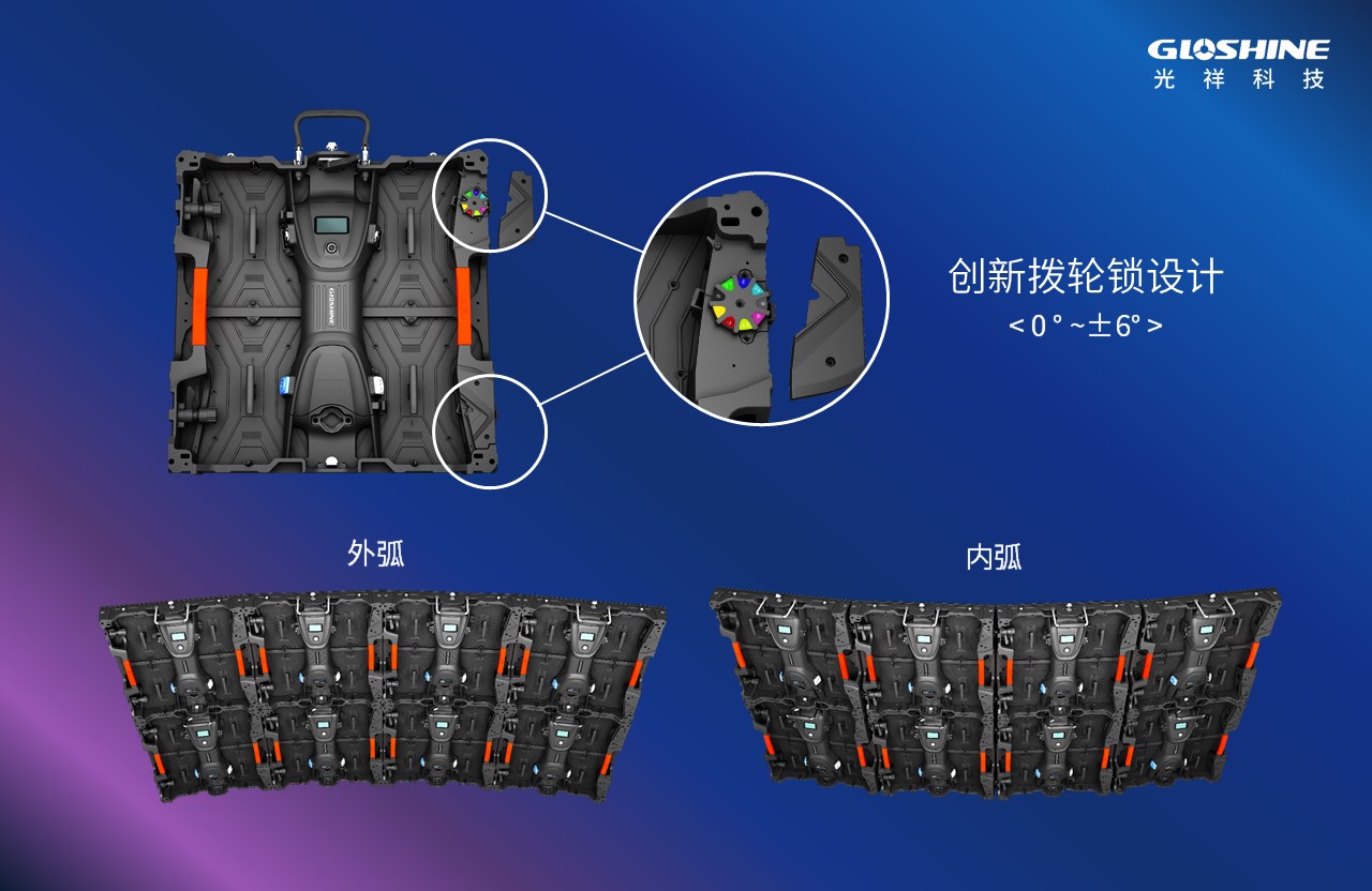 MV系列小間距LED顯示屏箱體同樣擁有兩個撥輪鎖,輕松實現弧形拼接,首次解決了小間距LED顯示屏不能弧形拼接的技術難點,使得小間距屏不再只有平直面一種展示形式,從此開啟弧形/曲面時代。