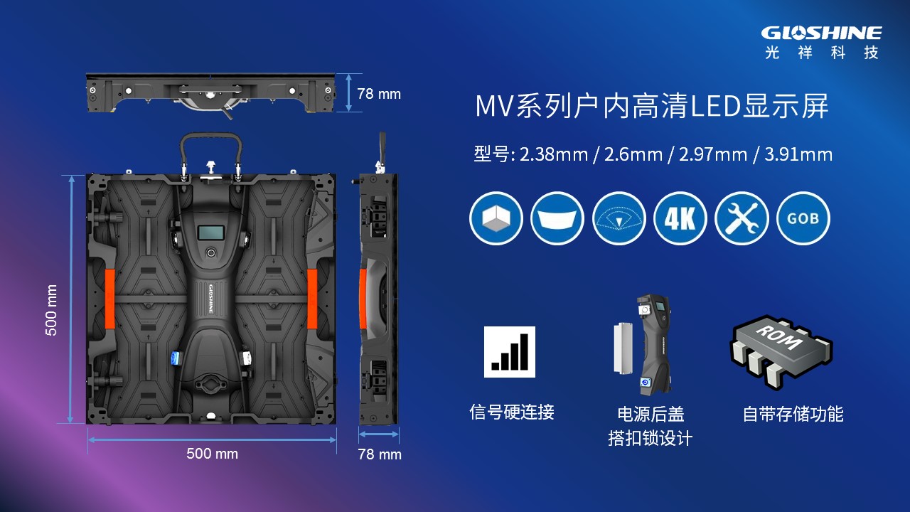 光祥品牌全彩LED產品色彩逼真、還原度高、超廣視角、性能穩定、使用壽命長,優品優質,是租賃行業的首選品牌。MV系列戶內LED顯示屏更是其中的佼佼者,燈珠金線封裝,硬件頂配,信號硬連接,性能更穩定。