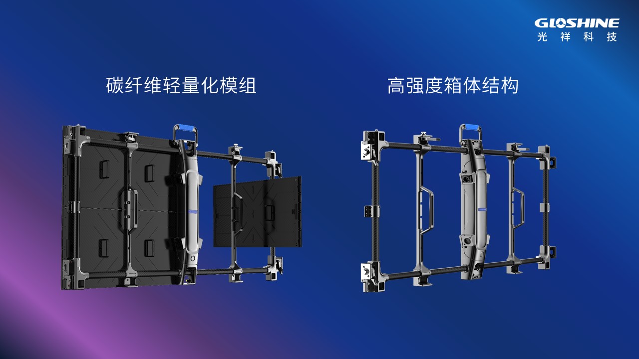 光祥CB系列戶內(nèi)戶外高清LED顯示屏采用碳纖維壓鑄箱體,戶內(nèi)屏最大厚度僅67.5mm,1000mm*500mm箱體小于等于8.9kg,500mm*500mm僅5.5kg;戶外屏最大厚度僅69.5mm,1000mm*500mm箱體不超過(guò)9.1kg,同面積箱體重量創(chuàng)行業(yè)戶內(nèi)外移動(dòng)租賃屏新低。