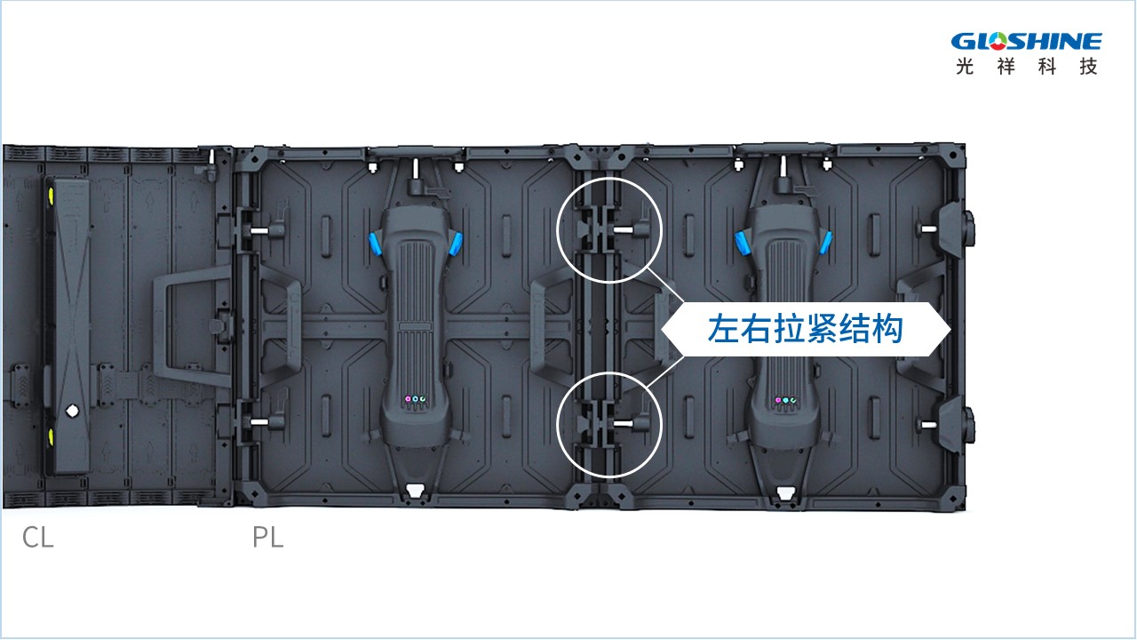 PL系列箱體有著一對左右拉緊機構,與角度弧形鎖相結合,讓箱體拼接高效、更緊密,銜接更平整。