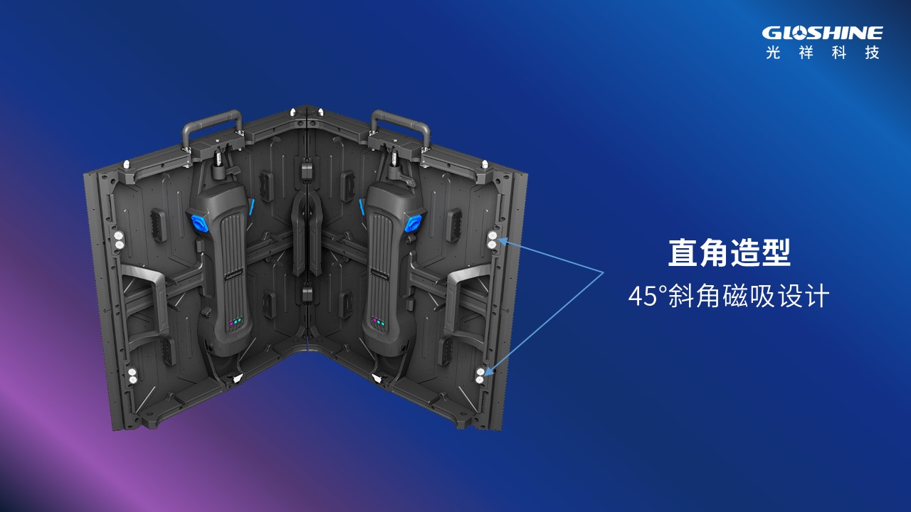 PL系列除了0°至±7.5°弧度造型的直角箱體外,可選45°斜角箱體,以兩邊各一對斜角磁吸裝置,實現快速直角拼接、立方柱拼接、凵形直角拼接等。