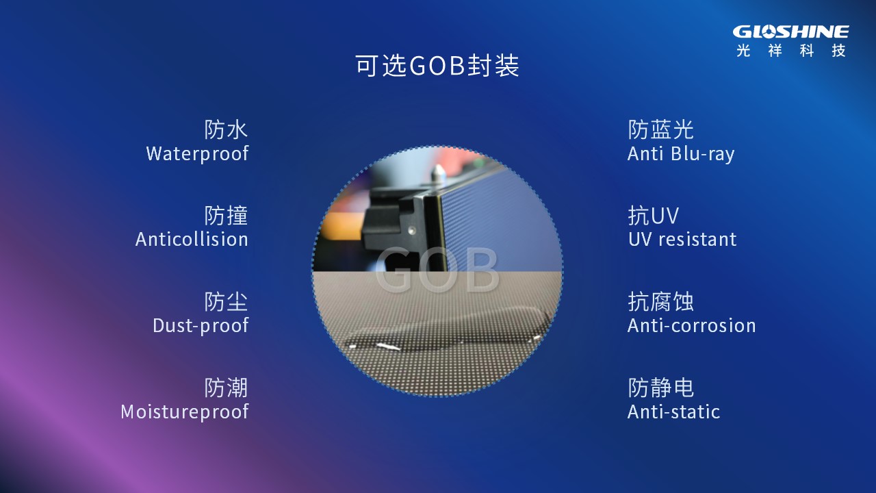 PL系列戶內高清LED屏可選GOB封裝工藝,防潮、防水、防撞、防塵,抗腐蝕、防靜電、防藍光、抗UV,減少摩爾紋,表面更平整,可視角度更寬廣,無懼季節氣候變更。