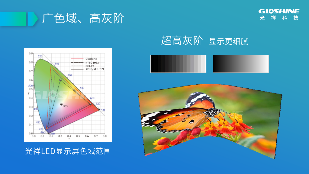 光祥MV Pro系列戶內高清LED顯示屏選用極黑燈,色域覆蓋DCI-P3標準范圍,提供更高的色深和對比度,色彩還原逼真。