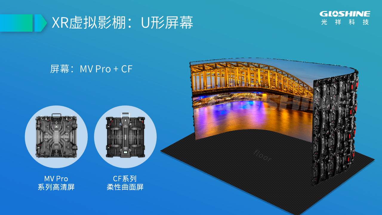 光祥MV Pro系列戶內高清LED顯示屏型號覆蓋P1.2/1.5/1.9/2.3/2.6/2.9,可進行0°至±7.5°弧形拼接,內直角、外直角拼接,舞臺塑形靈活。與CF系列柔性曲面屏拼接,塑造XR虛擬影棚經典背景屏幕,打造無限擴展的超時空視覺體驗。