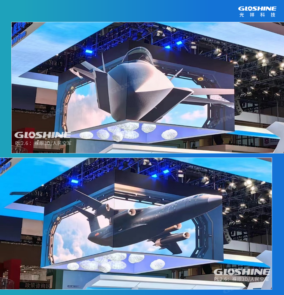 人民空軍展臺(tái)則以光祥PL系列高清屏塑造的裸眼3D立體屏幕,多方位展現(xiàn)空軍裝備性能和細(xì)節(jié)。內(nèi)外各四面屏幕,無(wú)論站在下方的哪個(gè)位置,都能看到直面而來(lái)的戰(zhàn)斗機(jī),倏忽飛馳而過(guò)。
