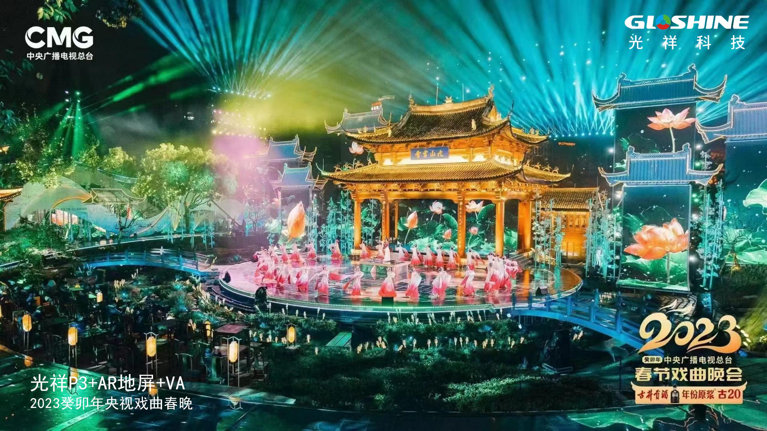 2023年央視春節戲曲晚會首次走出演播廳,來到南戲的誕生地浙江溫州,以中國現存最早的完整戲曲劇本《張協狀元》的編撰地九山書會作為主舞臺,應用了近2000平方光祥大屏,AR系列地磚屏鋪就小橋、廊、臺地面,P3戶外高清屏、VA透明屏塑造樓閣、廊、亭,營造唯美寫意又螢火璀璨的江南夜色。