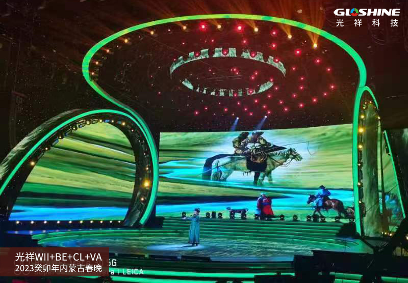 2023內蒙古廣播電視臺春節聯歡晚會晚會緊扣“黨的二十大”“鄉村振興”“共同富裕”“生態文明”“中華優秀傳統文化”“民族團結”等主題,應用光祥WII系列及BE系列高清屏、CL系列圓柱屏、VA系列透明屏,打造兼具曲線美及節日氛圍的舞臺效果,以異彩紛呈的節目承載社會風貌。