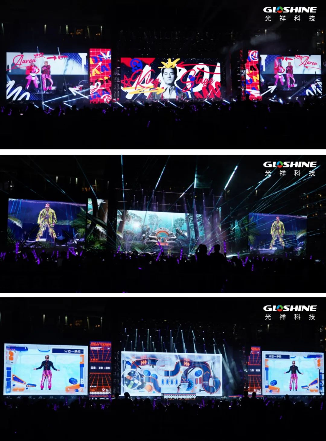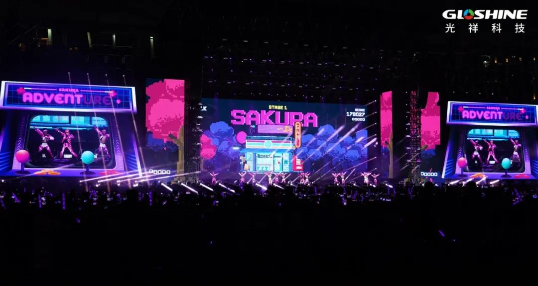 宏偉炫酷的舞臺位于寶體主場西面跑道,從居中的主屏幕到左右條形屏幕、兩側大屏,分別矗立于舞臺上方邊緣和兩側,而主屏幕前方則是如風車輪轉的可移動條形屏幕。與歌舞隨行,變動炫麗耀眼又不刺眼的華美色彩。