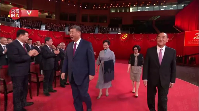 習近平和夫人彭麗媛在澳門特別行政區(qū)行政長官賀一誠和夫人鄭素貞陪同下步入現(xiàn)場,全場起立,鼓掌歡迎。
