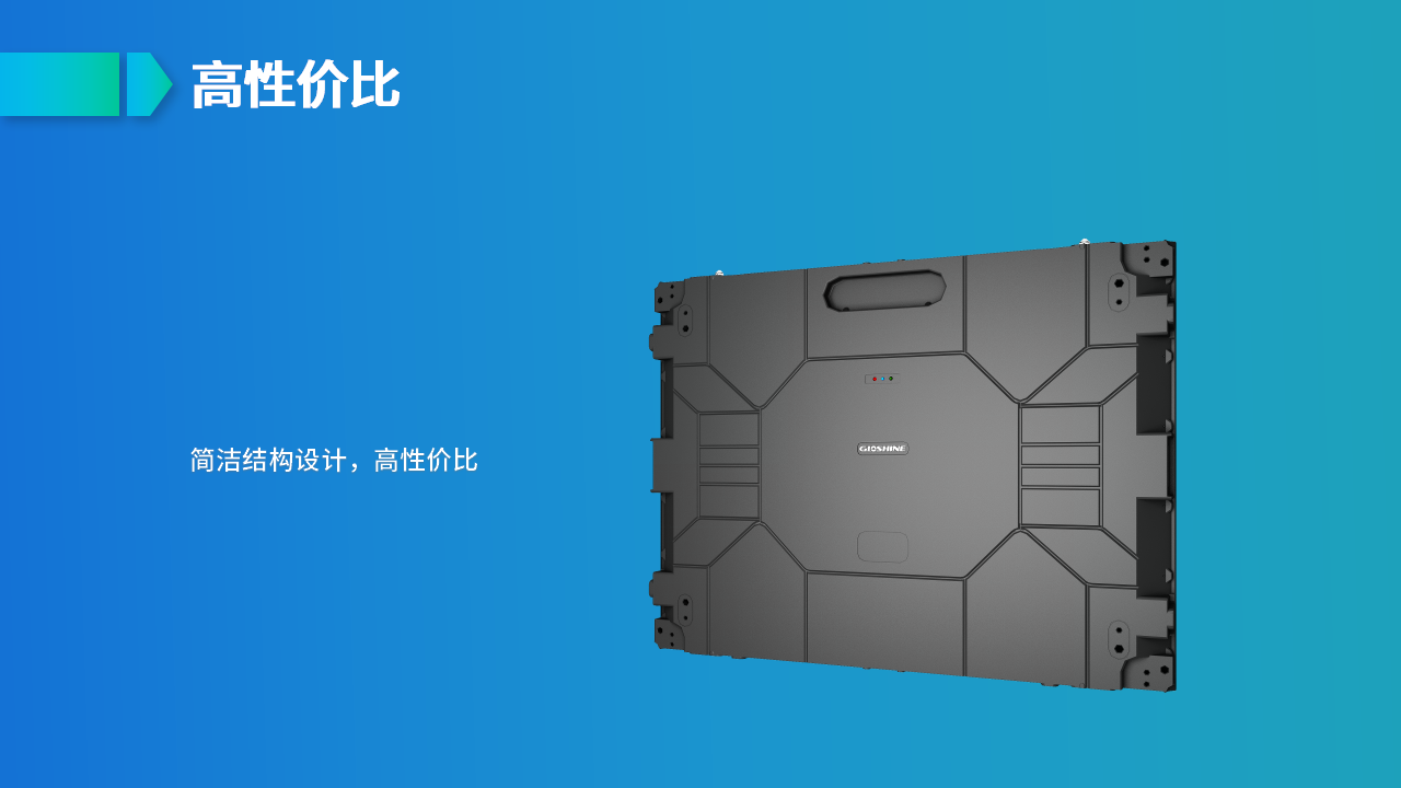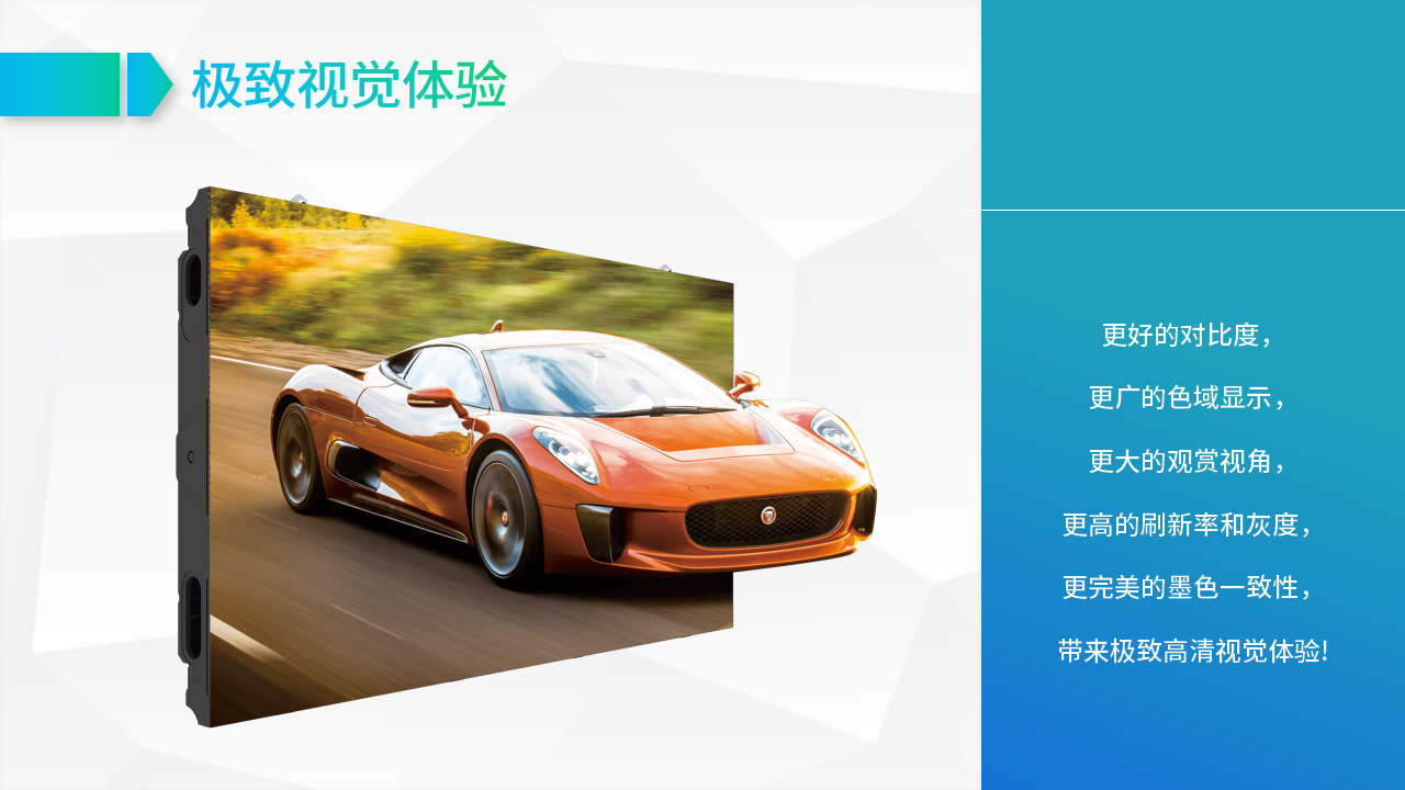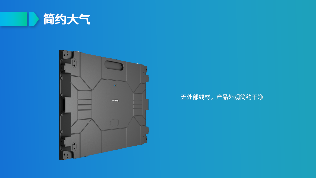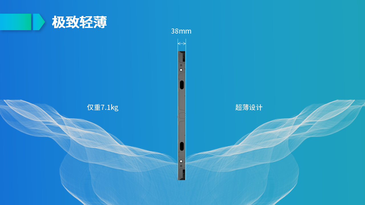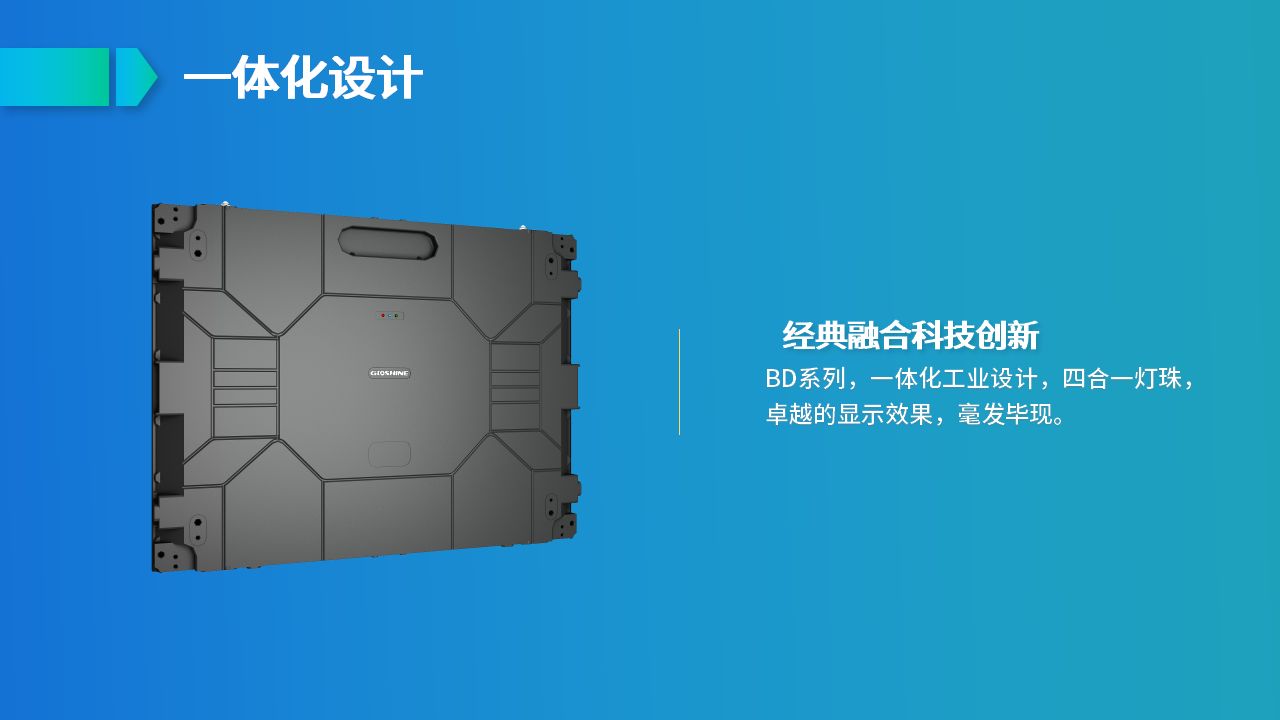 BD系列,一體化工業設計,四合一燈珠,卓越的顯示效果,毫發畢現;無外部線材,產品外觀簡約干凈;簡潔結構設計,高性價比;極致輕薄,僅重7.1kg;防磕碰設計,更好的保護燈珠,為運輸安裝保駕護航。