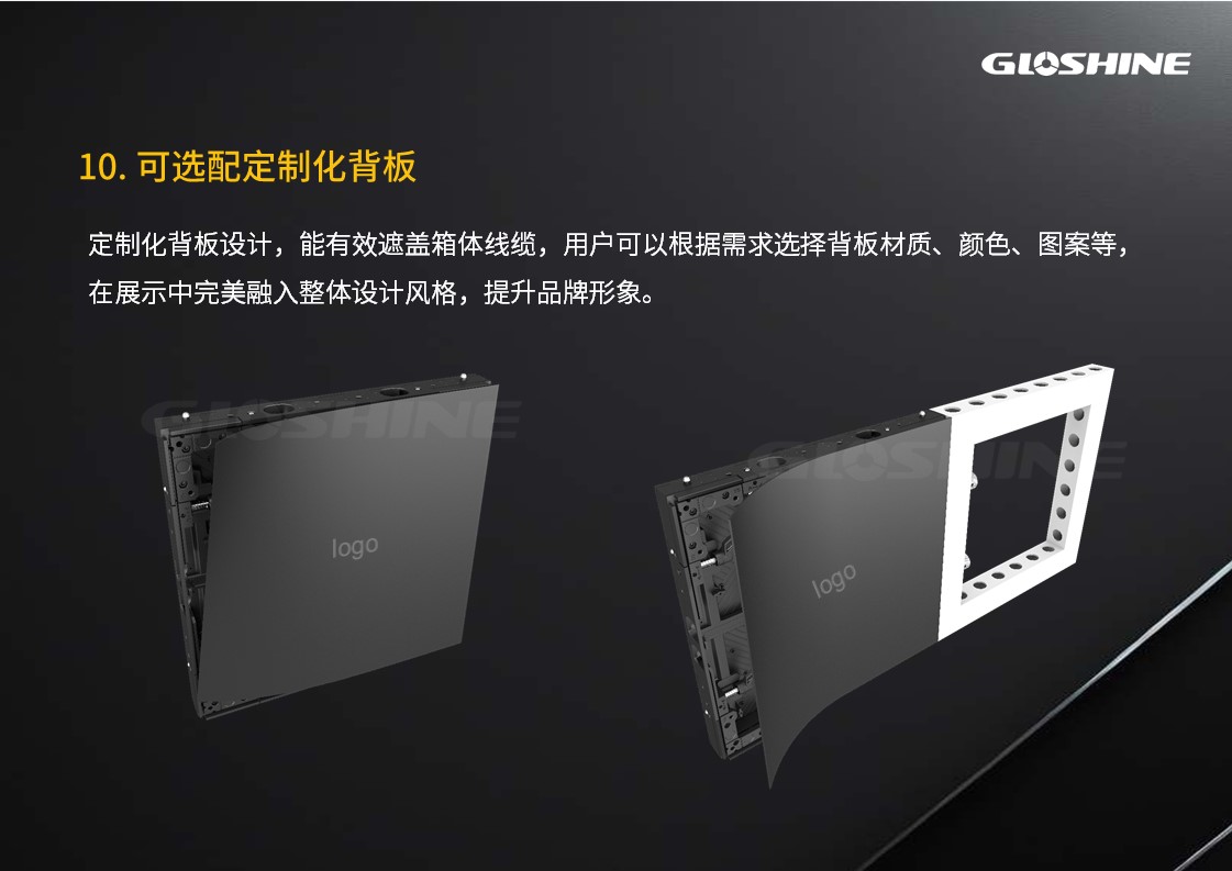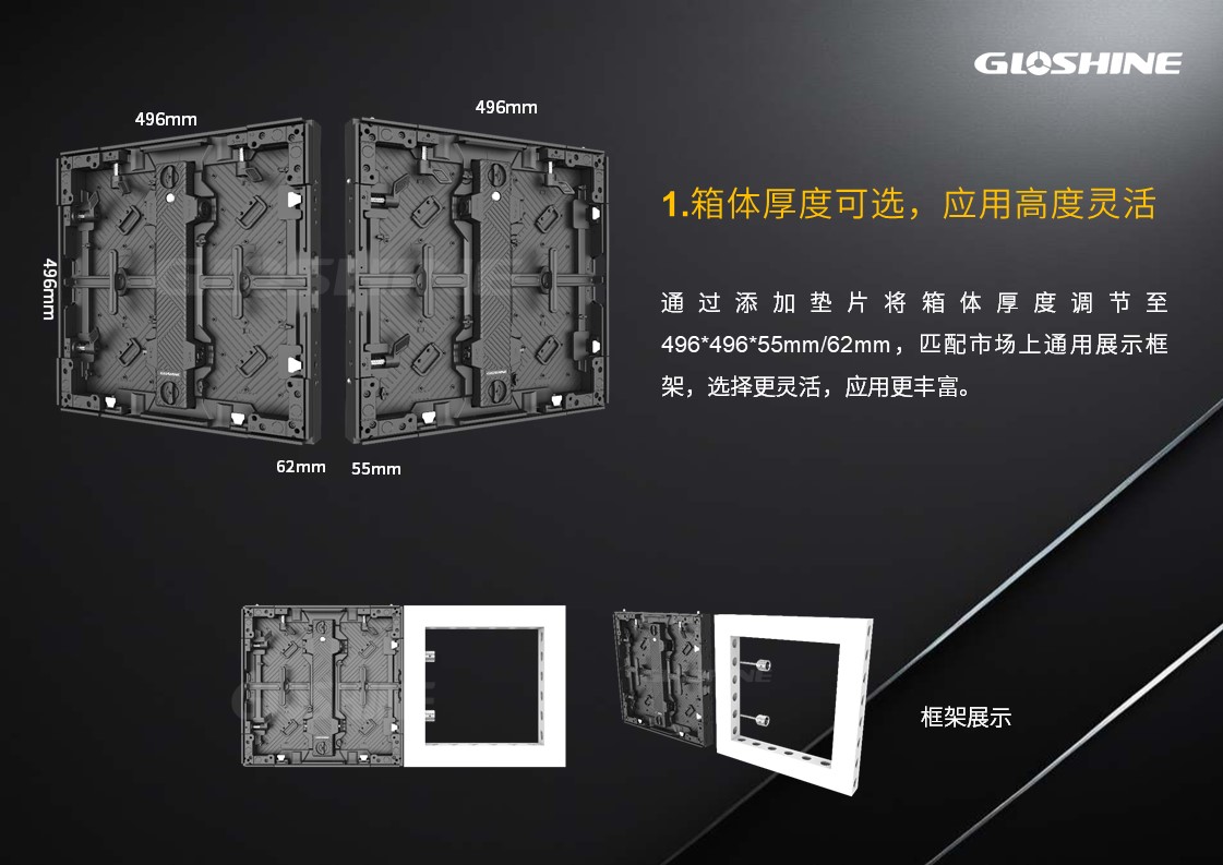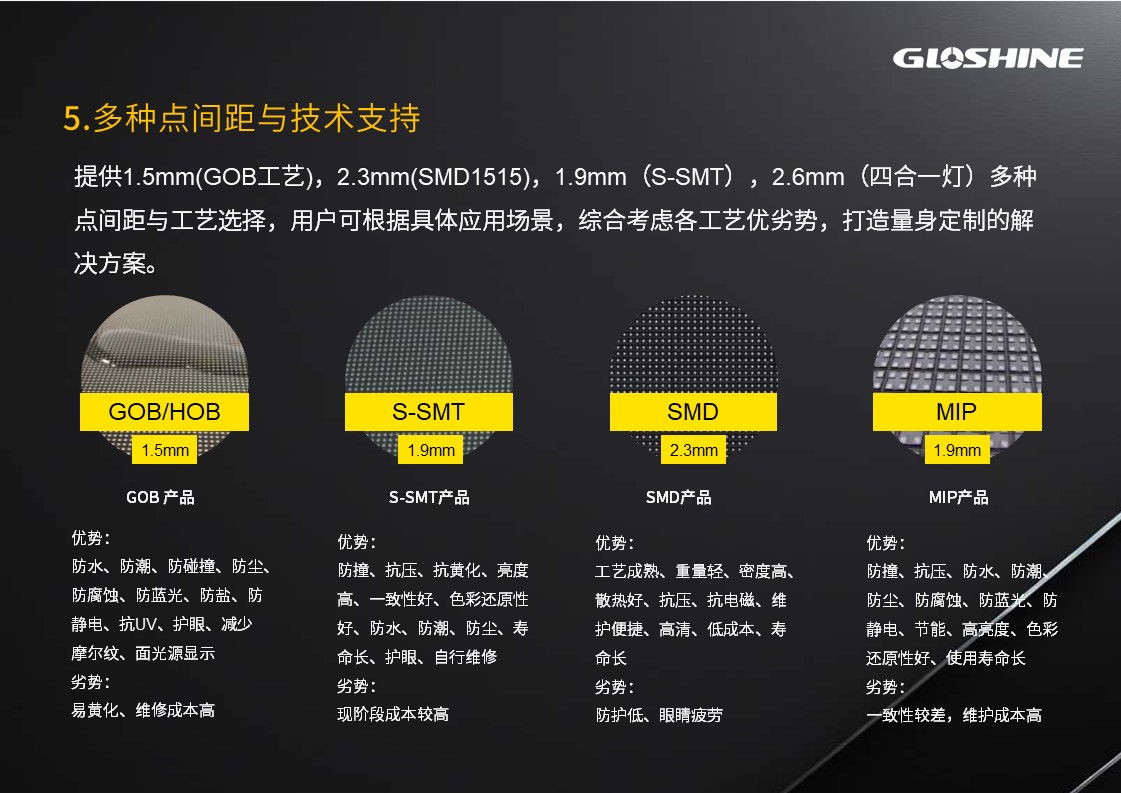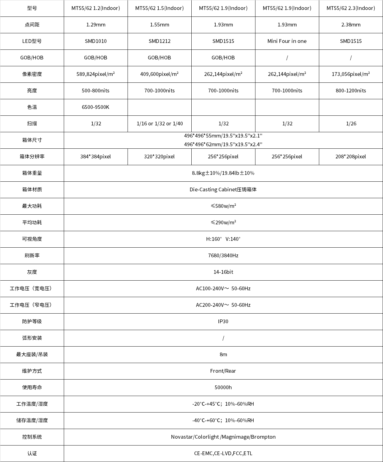 光祥MT 55/62系列LED顯示屏,P1.5/1.9/2.3,適配市場上通用展示框架,支持單邊切45°進行直角拼接,可選GOB/HOG、S-SMT、MIP、SMD多種工藝,可選定制化背板。